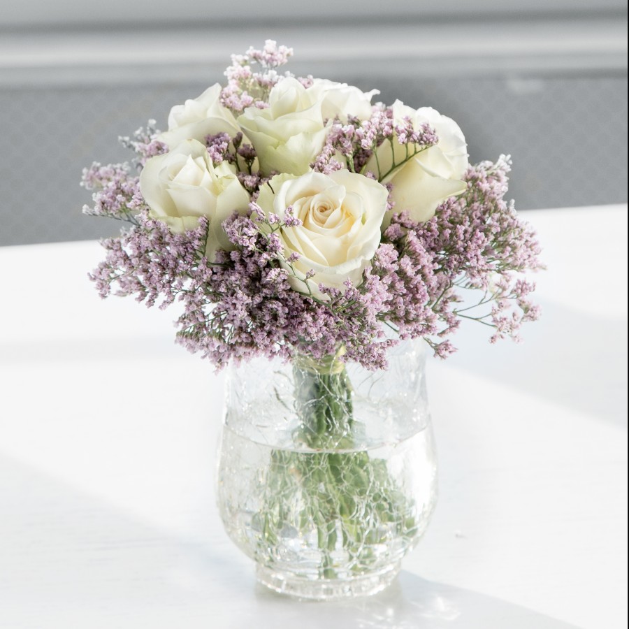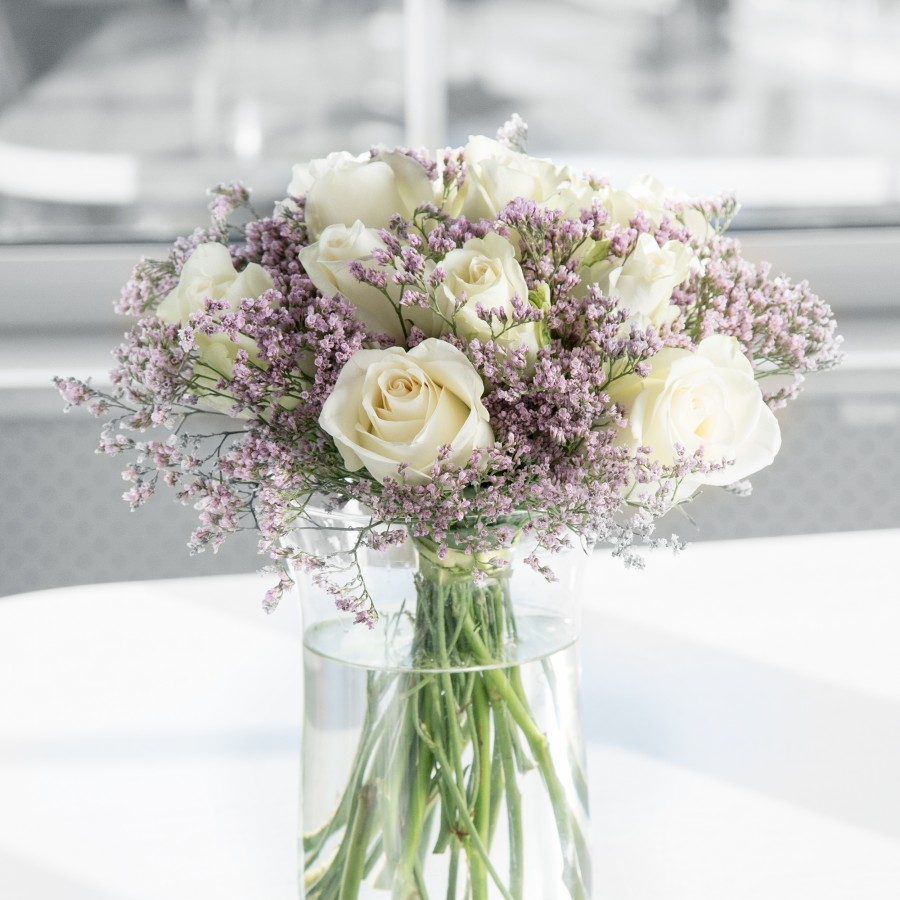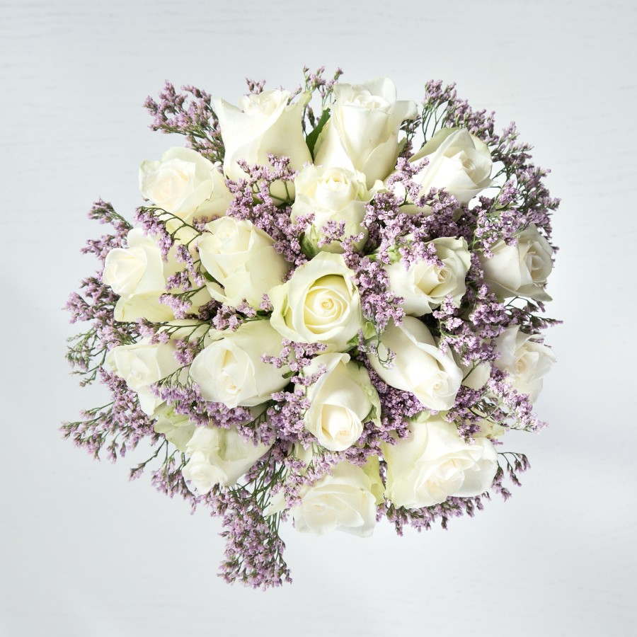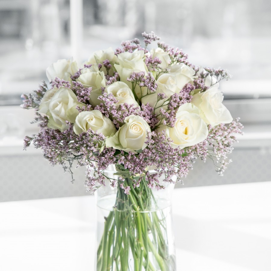 Indulge in the luxury of our exquisite white roses combined with elegant pale purple limonium. This sophisticated bouquet is meticulously arranged to showcase the finest blooms, offering a perfect blend of grace and style.